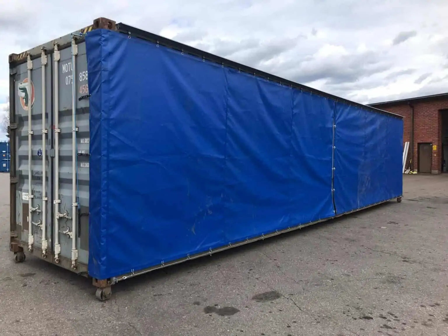 O carregamento lateral num contentor de lona de 12 m é prático. O lado prensável pode ser selecionado no momento da encomenda. Os contentores e as lonas estão disponíveis em diversas cores.